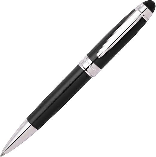 Make every signature a statement with the HUGO BOSS Icon Black Ballpoint Pen. Crafted from durable brass with a sophisticated dark chrome finish, this pen combines elegance and functionality. The medium point delivers smooth blue ink writing, and it is refillable with standard Parker-style refills for lasting use.